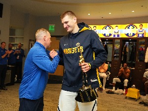 Nikoli Jokiću nakon trijumfa Denvera u meču protiv Vašingtona, trener ekipe Majkl Meloun u svlačionici je uručio novi, redizajnirani trofej za najkorisnijeg igrača regularnog dela NBA lige.